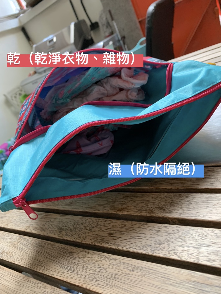 以後都不需要再多帶一個塑膠袋來裝髒濕的衣服(撒花),我是去程就把泳裝直接放進主袋,回程換下來的一樣放主袋,怎麼帶出門,怎麼帶回來!也不用怕到處滴水!且材質也是厚實耐用型也環保!