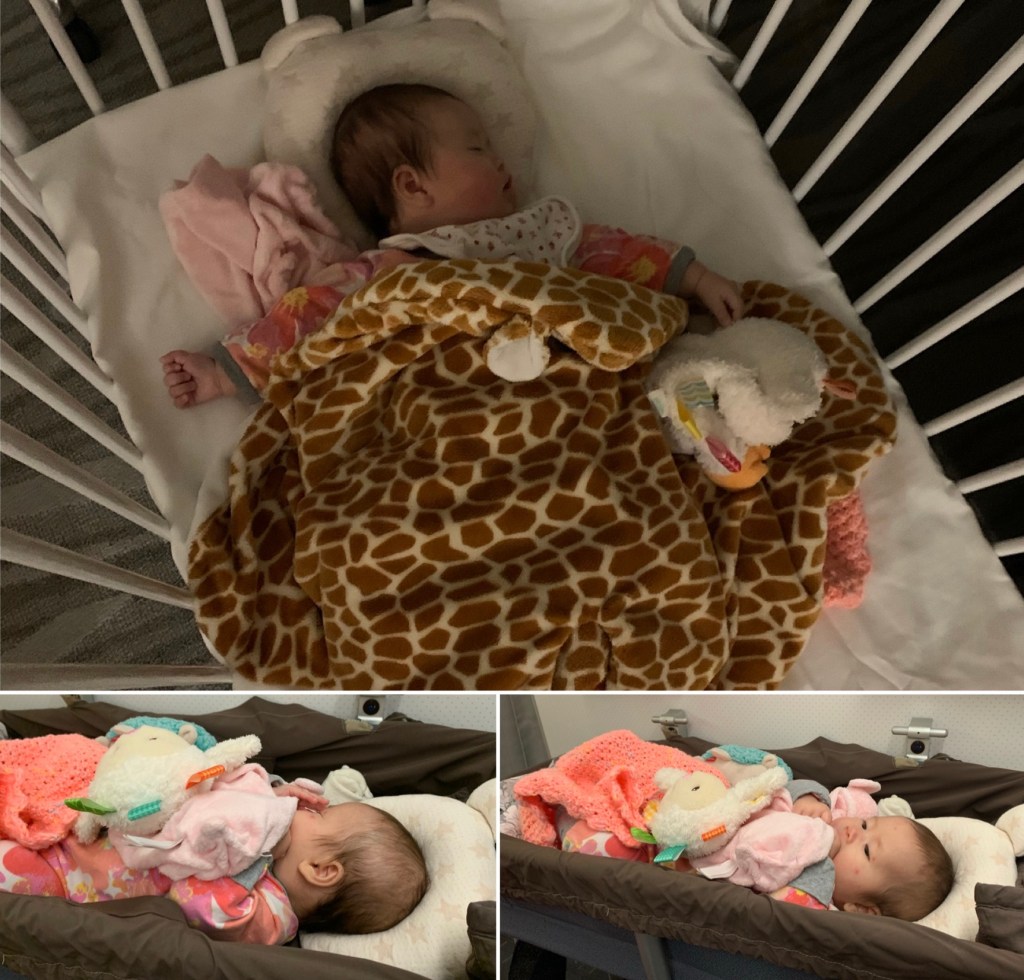 這是女兒在多倫多喜來登飯店,以及前往渥太華的飛機上(嬰兒籃)的時候,多虧有她的粉紅象,才可以不認床的好眠~最感激的時刻莫過於在飛機上,十幾個小時的飛行時間,有2/3的時間都在睡覺,沒有哭鬧!因為我相信所有父母都最怕自己的孩子在飛機上崩潰⋯⋯安撫巾是不是很強大!!!