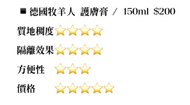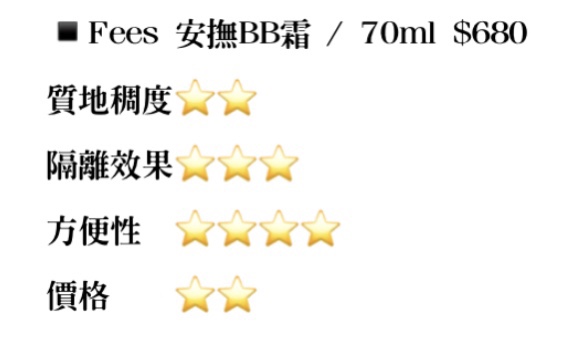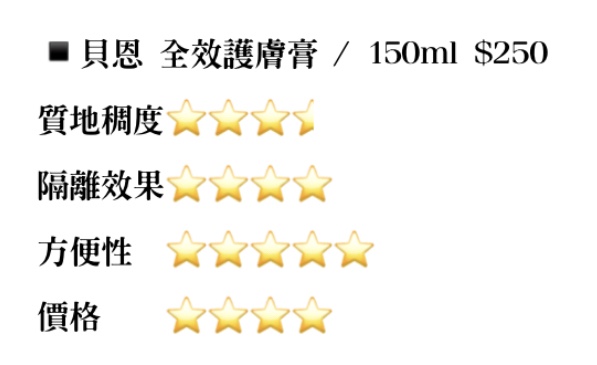 剩下的我會依:質地稠度(遞升越稠)、隔離效果、方便性及價格(遞升價格越低)來打🌟!