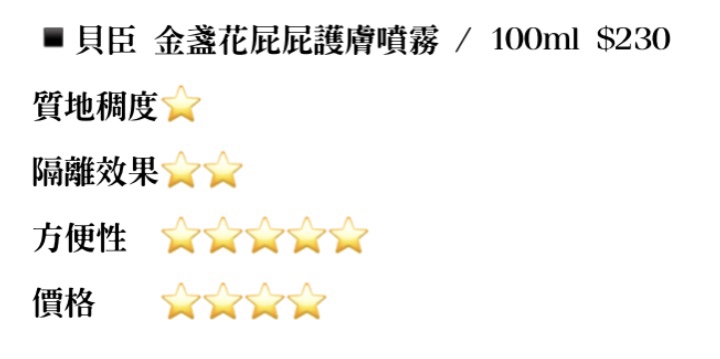 噴霧瓶裝;只要噴幾下就可以了,完全不沾手🤣雖然金盞花可以舒緩紅屁屁,但我認為這款比較適合在平時沒有紅屁屁或屁股真的嚴重到碰到就會痛的時候用(作洗澡後舒緩用,但還是要搭配其他屁屁膏)。另外,因為是噴霧水狀,隔離效果自然沒有其他膏狀好。
